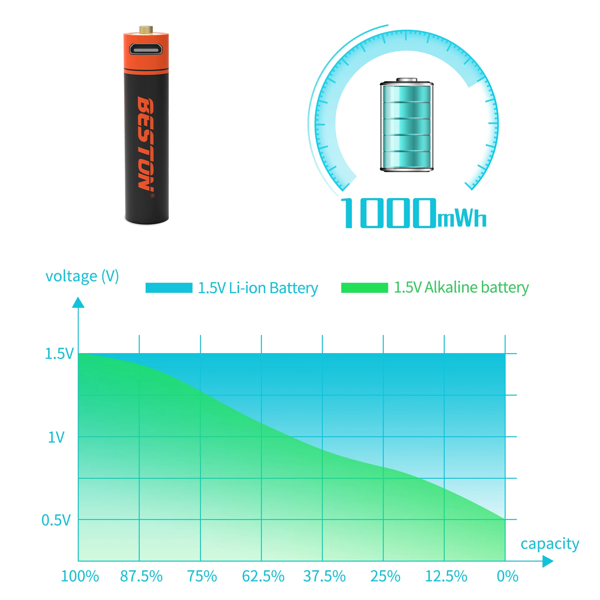 - Li-ion акумулятор із роз'ємом Micro-USB номінальною напругою 1.5V. Повністю повторює функціонал звичайної лужної батарейки (лужної марганцево-цинкової батареї/alkaline battery), але із можливістю багаторазового заряджання. На відміну від Ni-Mh (нікель-метал-гідридних) Li-ion акумулятори не мають ефекту пам'яті, швидше заряджаються та мають кращу енергоємність.