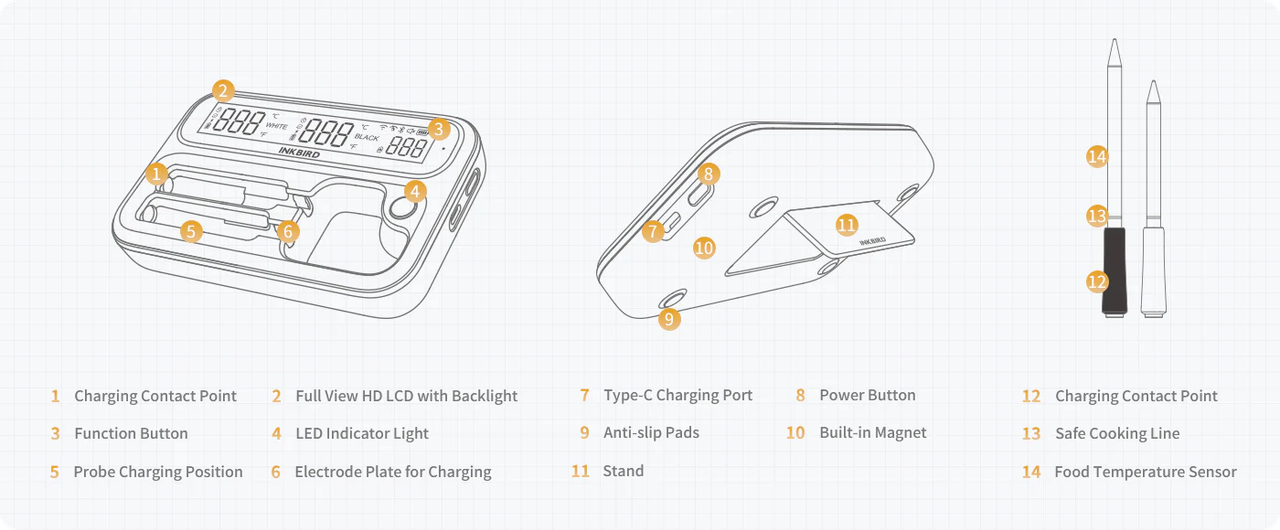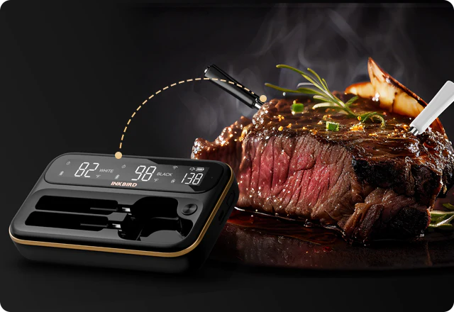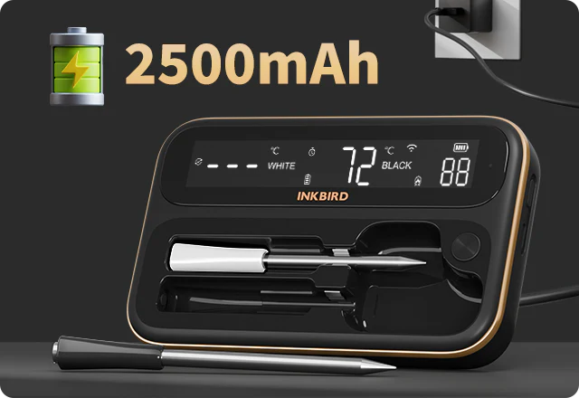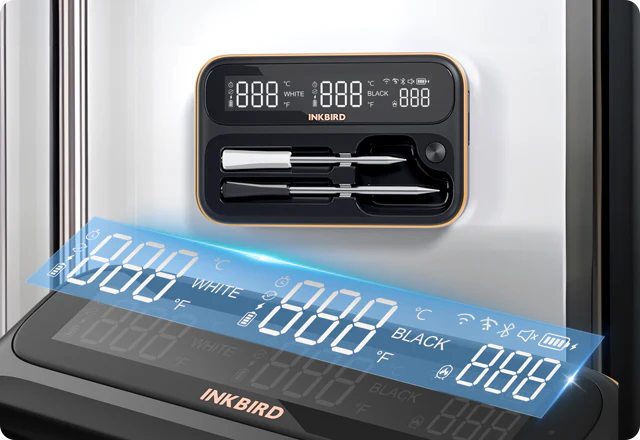 INKBIRD INT-12-BW - це бездротовий термометр, що поєднує універсальність і високу точність, оснащений довгим і коротким зондами для різних кулінарних завдань. Довгий чорний зонд ідеально підходить для запікання великих шматків м’яса, дозволяючи одночасно контролювати внутрішню та навколишню температуру, тоді як короткий білий зонд оптимальний для менших шматків і делікатних страв.